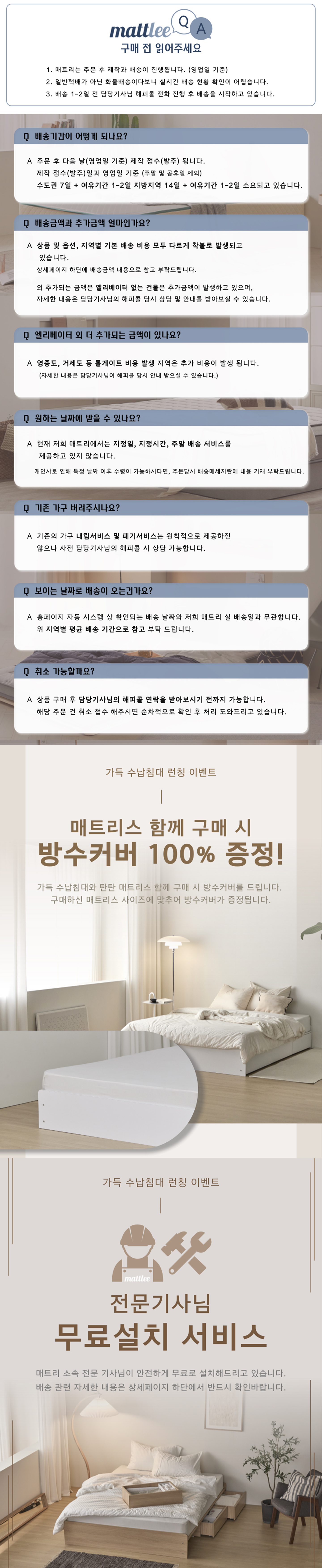 - 매트리스류 꺼짐 현상에 대한 AS는 1년 보장으로 진행하며, 국가 기준에 맞춰 진행합니다.
